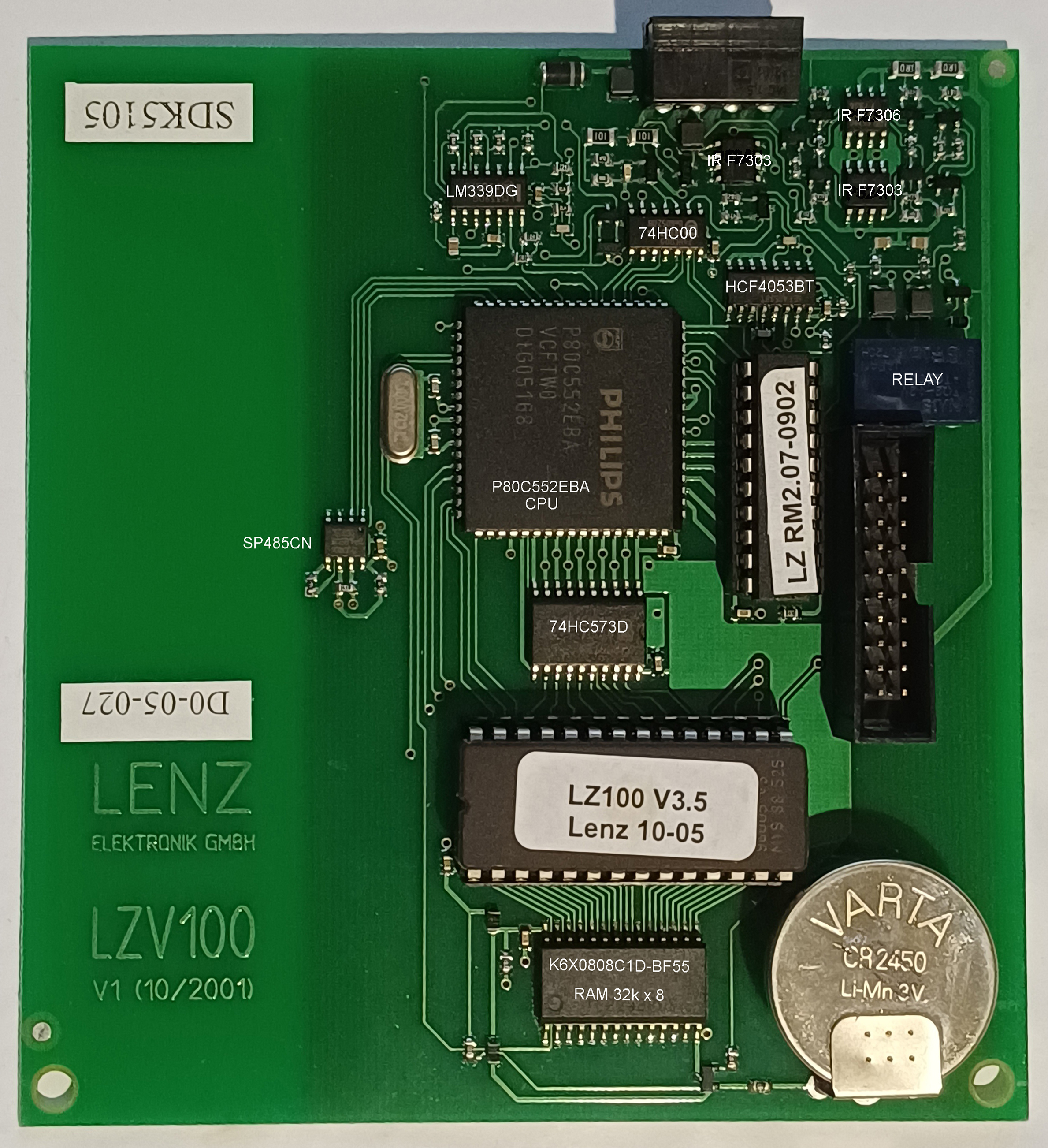 Inside the LZV100 are 2 PCBs joined by a short ribbon cable. The top board has the PQRS connector and the main CPU. The CPU has either an ultraviolet erasable EPROM or a onetime PROM with the program in it. The label gives the version and covers the UV window. Next to the PROM is the RAM chip and backup battery. The lower board is the booster and has the power input and DCC output connector UVJK. The DCC output uses an FET bridge circuit to drive up to 5 amps.